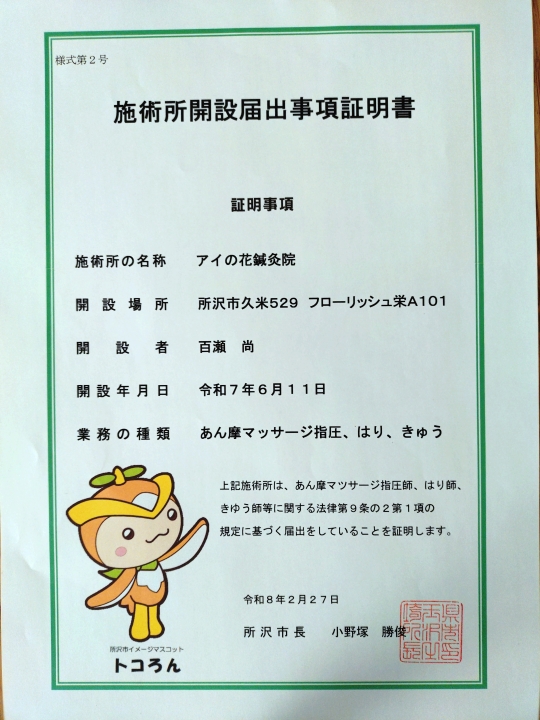 その教えを心と腕に刻み、私のふるさとである所沢に治療家として恩返しがしたいと思い、患者様の施術にしっかりと向き合って参ります。